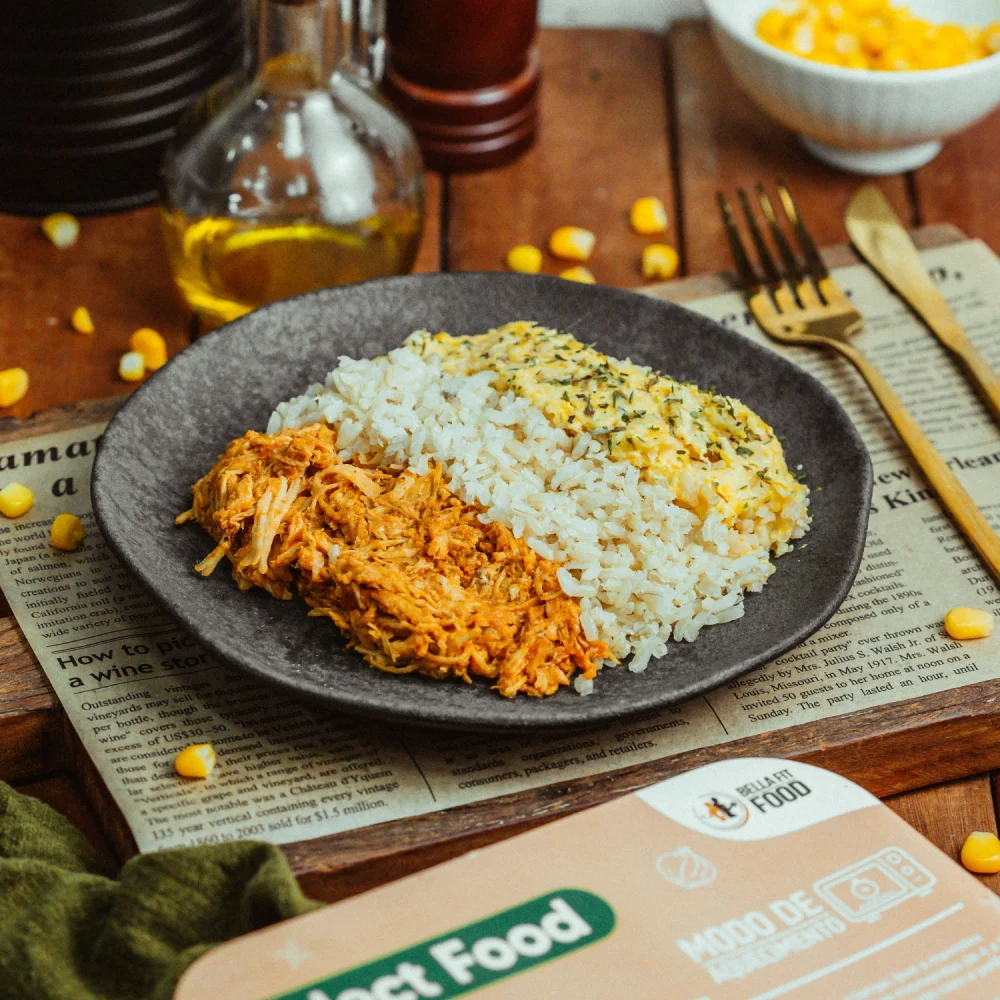 4un Ragu de Frango com Arroz Integral e Creme de Milho: Delicie-se com o sabor do frango desfiado em um ragu irresistível, acompanhado pelo arroz integral e um delicioso creme de milho. Uma refeição leve, equilibrada e repleta de sabores que ressaltam a essência do verão. 300g – 335kcal