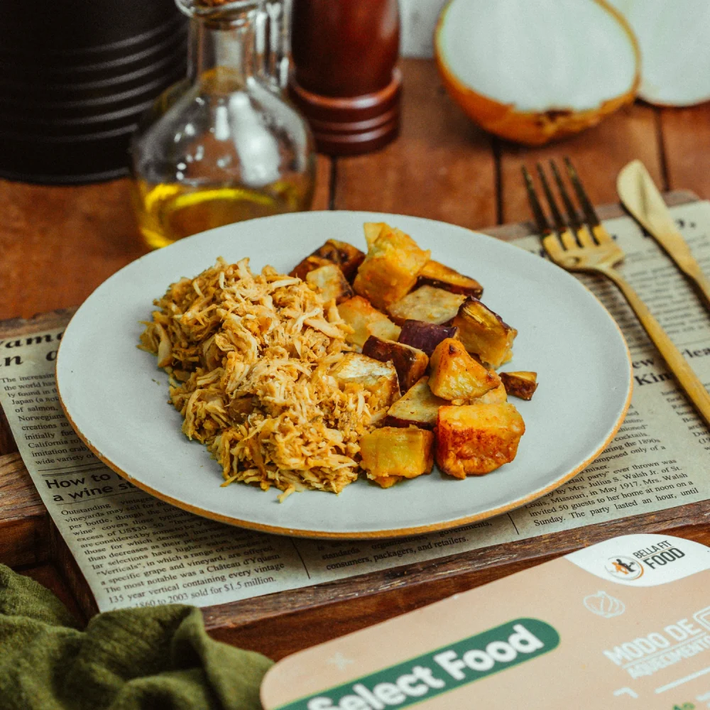 4un Frango Desfiado com Batata Doce Assada: Saboreie o frango desfiado combinado com a doçura da batata doce assada. Uma opção que equilibra proteínas e carboidratos de forma deliciosa, ideal para manter sua energia durante os dias ensolarados. 300g – 391kcal