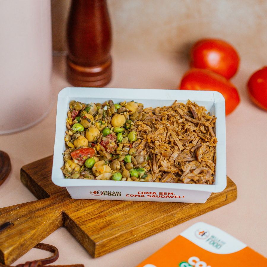 4 un. Carne lagarto desfiada com mix de grãos (grão-de-bico, lentilha, ervilha e tomate) 252kcal