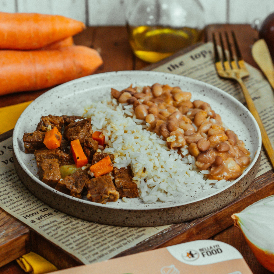 Ingredientes: Carne patinho, arroz branco, feijão carioca, cenoura, batata, alho, cebola, sal, salsa.