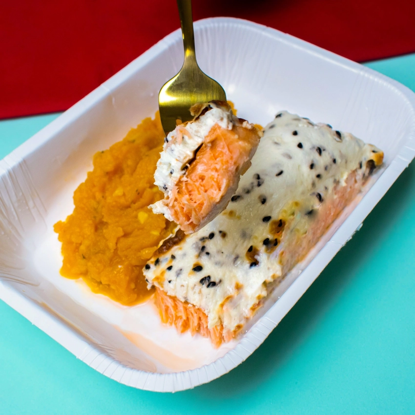 Ingredientes: Salmão, Abóbora cobatian, Cream cheese, Gergelim preto, Gergelim branco, Azeite, Sal, Hortelã.
